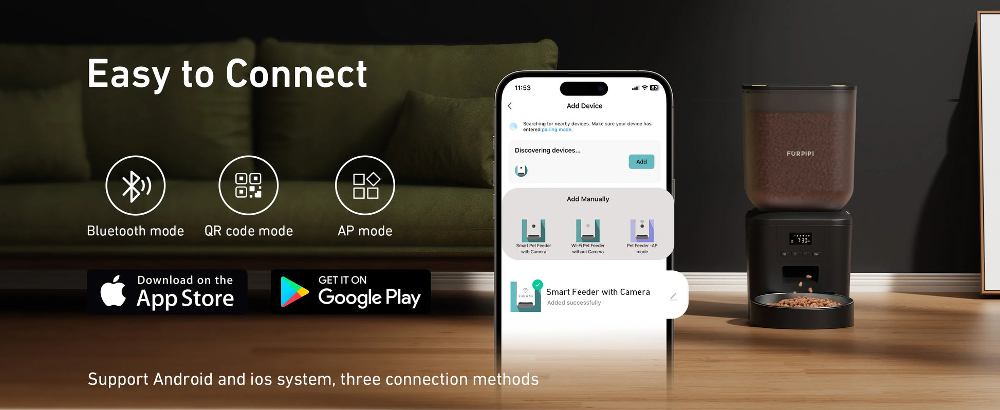 O alimentador automático Furpipi com câmera é extremamente fácil de usar, conectado via Wi-Fi de 2,4 GHz/5 GHz e intuitivo, permitindo que você programe e monitore as refeições do seu pet a qualquer hora e em qualquer lugar com o aplicativo "Pet Zero" para celulares iOS e Android. Você pode alimentar seus pets a qualquer hora e em qualquer lugar pelo seu smartphone e visualizar o registro de alimentação no aplicativo para garantir que o dispensador de ração esteja funcionando conforme o programado. O dispensador inteligente de ração pode ser controlado pelos smartphones de vários membros da família.