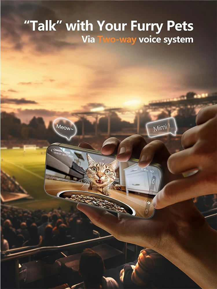 O alimentador inteligente Furpipi para animais de estimação possui uma câmera HD com alta resolução de 1080p e amplo ângulo de visão, permitindo que você veja e ouça seu animal de estimação a qualquer hora e em qualquer lugar, garantindo que você não perca nada.